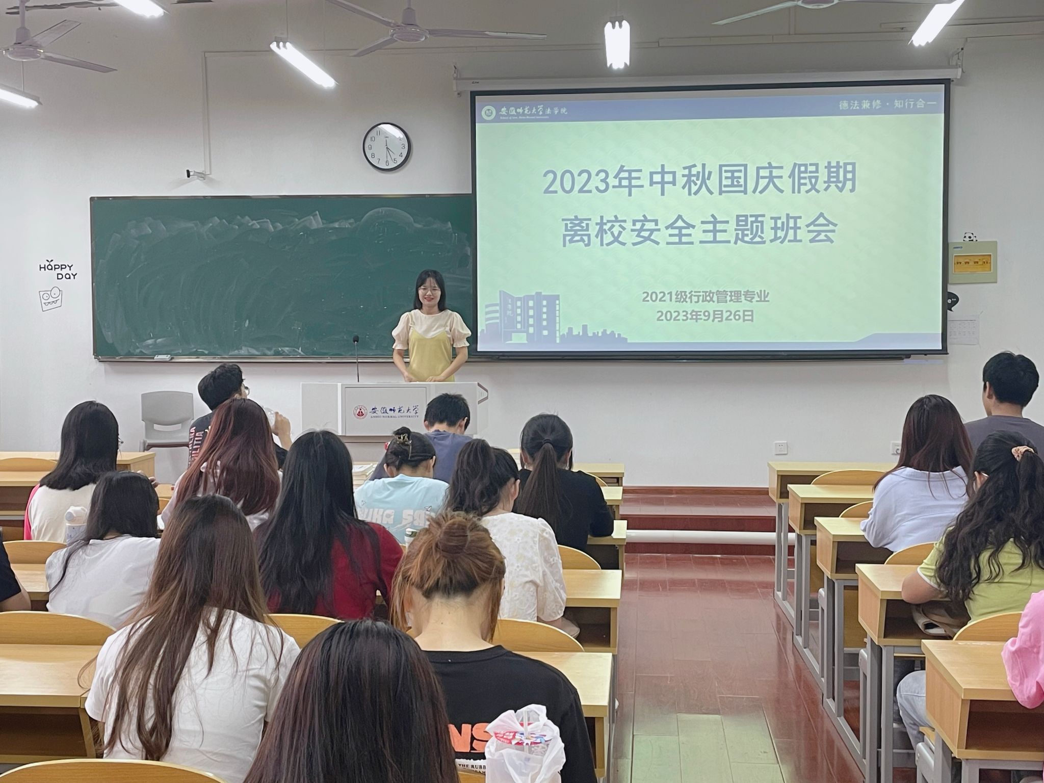 本网讯(必一·运动(B-sports)官方网站 赵悦 李宇欣)欢度假期,安全同行。为做好中秋国庆假期员工离校工作,确保假期员工安全,9月26日下午,必一·运动(B-sports)官方网站2021级行政管理、社会学和社会工作专业于教学楼1503教室依次召开2023年中秋国庆假期离校安全主题班会。会议由辅导员赵悦主持,班级全体同学参加。