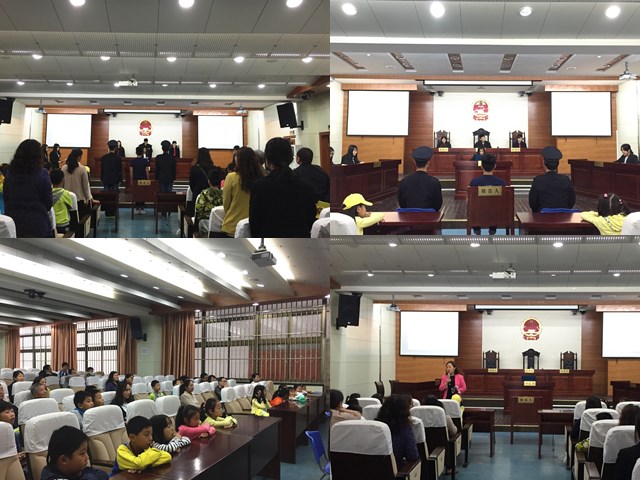 公演活动第一项,由王兰对小员工们及老师、家长的到来表示欢迎,并为大家介绍青法社本次的公演活动。掌声中,青法社的公演活动便开始了。首先,由书记员宣读法庭纪律,一声“全体起立”,不仅书记员站起,台下所有的大观众、小观众们也严肃起来,跟着起立。待审判长、公诉人、辩护律师就坐后,两位法警便押着“犯人”入场了。开庭审理前,已经播放了此次“校园暴力”案件的背景视频,观众们对案件也有简单的了解。本次的案件是一起校园自卫持刀伤人案,在公诉人的审问和举证中,案发当时的情况逐渐展现了出来。公演结束,接着由青法社的理事用PPT为大家细讲校园暴力的影响,一组组的图片,让大家深知校园暴力的危害。