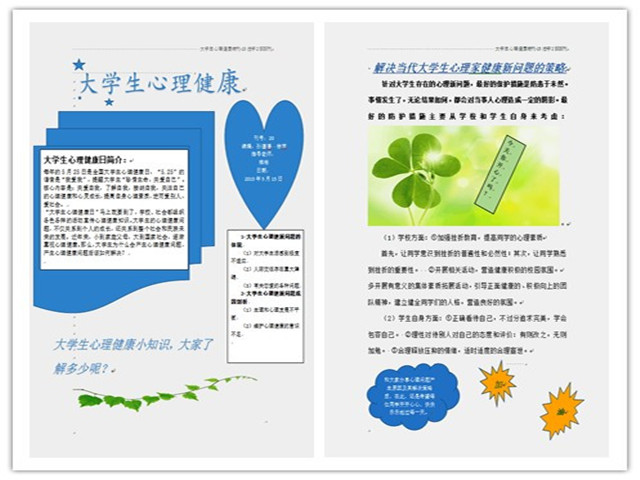 为进一步提高老员工的心理素质,宣传普及心理健康知识,深入开展心理健康教育,15法学2班在积极组织和参与学院5.25心理健康活动月的有关活动的同时,还结合学院安排在5月份也开展了利用班刊普及心理健康知识的教育活动。