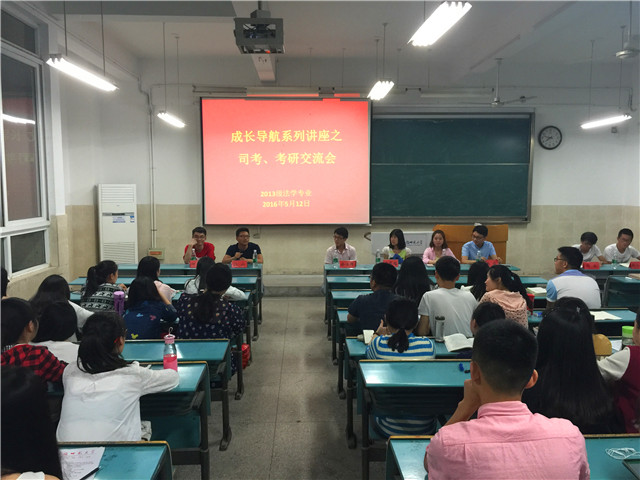 近日,2013级法学专业在教室2010304举办成长与起航系列讲座之司考考研交流会。12法学中成功通过司考或考研的何舟宇、江山、徐汪群、王梦瑶、王燕华、姚俊、刘波和赵壮壮同学受邀参加此次交流会、分享经验。本次交流会由两班班长主持,13法学专业全体员工到场聆听。