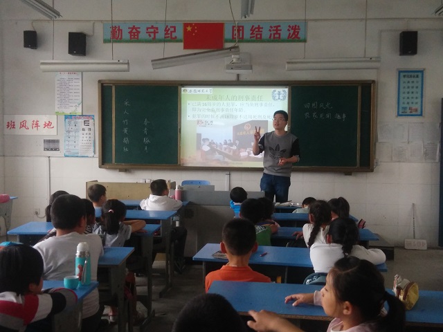 在石硊中心学校(小学),由团队小学一、二两组为四年级一班、二班普法。一班普法以“未成年人的法律地位”为主题,由郭臻担任主讲人。郭臻分未成年人定义、未成年人的民事行为能力、刑事责任能力三个板块,向小学的同学们详细的分析了在达到18周岁法定成年之前,不同年龄阶段人的民事、刑事责任。通过大量数据、动漫图片,结合一些生动易懂的举例,使讲解贴近小学实际,同学们更能接受这些抽象的定义。通过这次普法,同学们对自身所在的年龄阶段应有的法律地位形成了初步认识,他们的法治思维水平进一步得到提高。