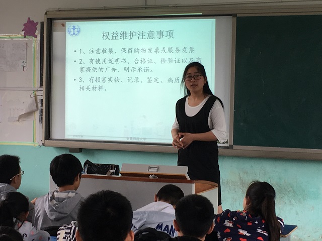 在石硊中学,中学二组对七年级二班进行“消费者权利”为主题的普法。主讲人赵露雅依次讲解了消费的定义、消费者权益、权益维护方式、维权注意事项四个部分,她通过PPT讲解和与同学们互动相结合的方式,将普法内容顺利转化为中员工津津乐道的生活化常识,在沟通与交流中将课堂普法变为一场法律知识的交流会。