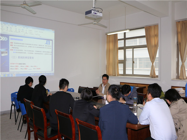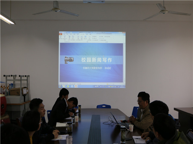 会议正式开始,徐成进分别从"新闻是什么"、"怎样写新闻"、"新闻写什么"三个方面向大家介绍了如果去写校园新闻稿。徐成进首先从校园新闻的概念出发,指明新闻即是“新+事实+报道”,着重强调新闻讲求的是报道的时效性、准确性、简洁性和立体化。接着说到新闻基本六要素,新闻的写作结构,再到各部分的写作方法。徐成进认为一篇好的新闻稿从一个好的标题开始,开首要语句优美,这样才能吸引读者眼球,而中间要内容丰富,结尾要响亮有力。写前要思考,讲究谋篇布局,将各种写作手法灵活运用于新闻中,既客观真实,又很好的提高读者的阅读兴趣。最后徐成进说到撰写新闻稿要善于从各种活动中寻找新颖的题材,挖掘出有价值的新闻亮点,学会从各类信息提炼最重要的内容,同时要注意细节,多看多练。