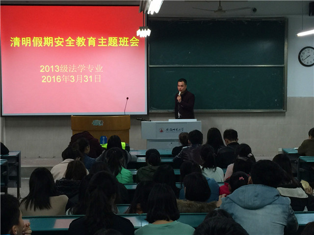 3月31日晚四点半,2013级法学专业在教室2020104召开清明假期安全教育主题班会。本次班会由2013级法学专业辅导员陈兴宇主持,13级全体员工到场参加了此次班会。