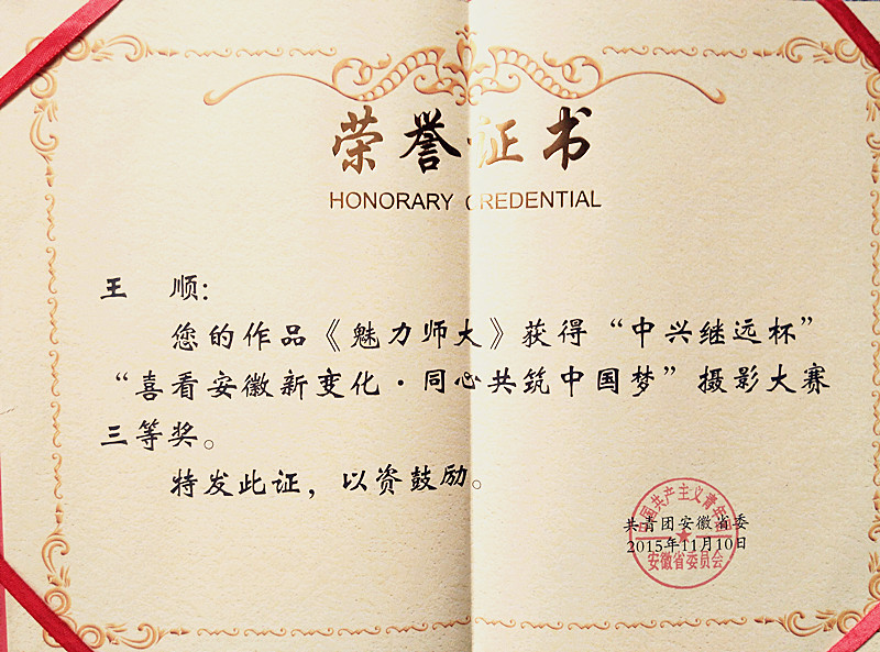 2015年11月27日,由共青团安徽省委举办的2015年中兴继远杯“喜看安徽新变化·同心共筑中国梦”安徽省摄影大赛颁奖仪式在省会合肥举行。团省委副书记李国阳、中兴继远信息技术股份有限公司董事长徐强、安徽日报主任记者李博出席颁奖仪式并为获奖选手代表颁发证书,获奖选手代表、摄影爱好者等50余人参加颁奖仪式。公司13级卓越司法班王顺同学的作品《魅力师大》喜获全省三等奖。