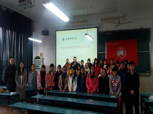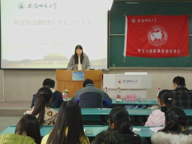 为总结社团学期工作成果,发现问题,查找不足,为下学期社团工作开创新局面,12月23日中午12点10分,外交协会在行知楼2020304教室召开2015年期末总结大会。社团指导老师李路根老师、社团会长周小凡同学,副会长钱立刚同学、王顺同学,以及社团主席团助理、社团顾问委员会成员、各部门部长、副部长和全体理事共计七十余人参加了大会,大会由副会长王顺同学主持。