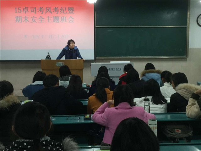 在期末考试以及寒假来临之际,为了端正考风、严肃考纪,提高同学们的假期安全意识,12月28日,15卓越司法班召开考风考纪暨期末安全教育主题班会。会议由院团委书记兼15卓越司法班辅导员王虹圆主持,15卓越司法班全体同学出席参加。