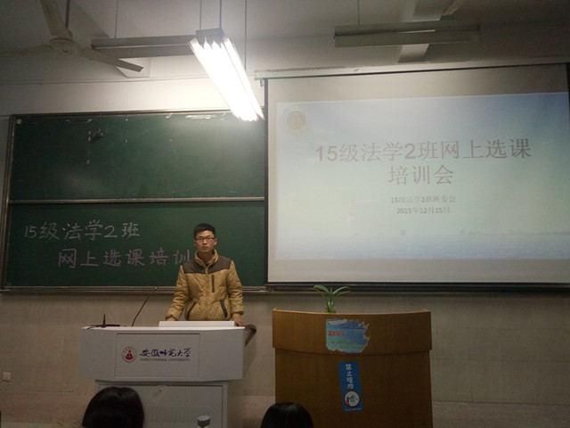 为了让同学们更好的了解大学选课过程,12月15日晚15法学二班在固定教室2020103召开选课培训会,培训会会由学习委员袁锋主持,辅导员桂彬老师在旁指导,全体法学2班的同学参与此次培训会。