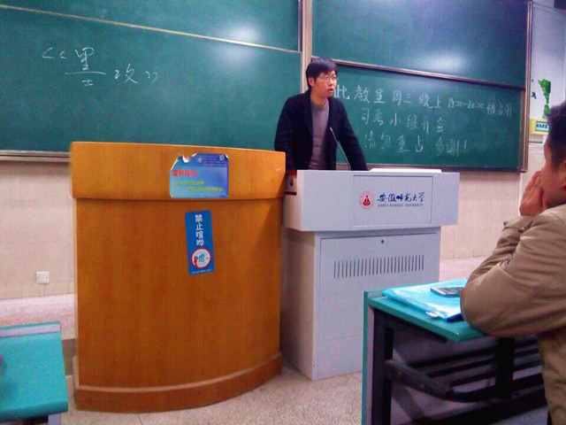 此次会议主要分为两部分内容,首先方彬彬从司考小组存在的意义、小组人员组织管理问题以及活动时间及形式问题三个方面做发言,简要介绍了司考小组今后活动开展的形式,并在时间安排上征求大家意见。接着,为了鼓励同学们正确看待司法考试,郭敬东老师结合自己的司考经历,向同学们传授司考经验并对同学们寄予了深厚期望。