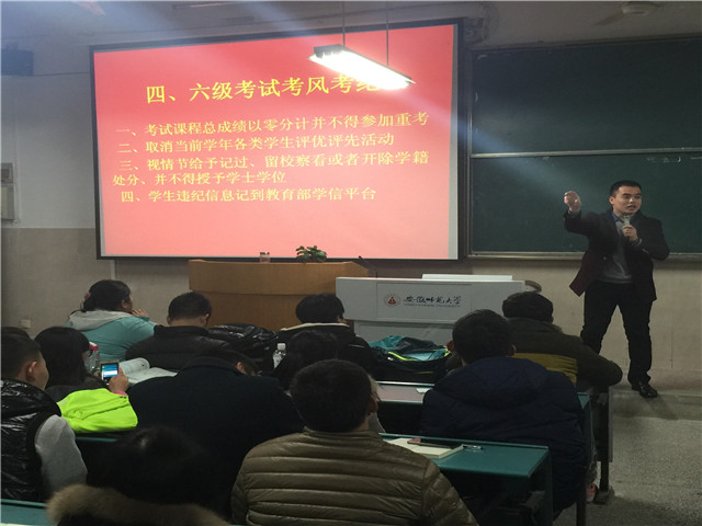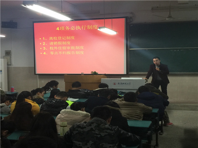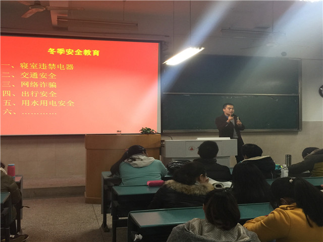 首先,陈兴宇从“寝室违规电器”、“交通安全”、“网络诈骗”、“出行安全”、“用水用电安全”等五个方面强调了冬季安全问题,要求同学们贯彻落实“离校登记制度”、“请销假制度”、“校外住宿审批制度”、“零点不归报告制度”等四项务必执行制度。在四六级考试到来之际,他还嘱咐同学们严格考风考纪,遵守考场纪律,不得违反校纪校规;否则将致使考试课程总成绩以零分计并不得参加重考,取消当前学年各类员工评优评先活动,视情节给予记过、留校察看或者开除学籍处分,并不得授予学士学位,员工违纪信息记到教育部学信平台。此外,他还通知了必一·运动(B-sports)官方网站“2015年本科生优秀毕业论文培育计划”的有关事项,希望同学们踊跃参加。最后,陈兴宇介绍了我班同学考研的大致情况,并表示将在下一阶段进一步了解同学们的学习计划和考研进度