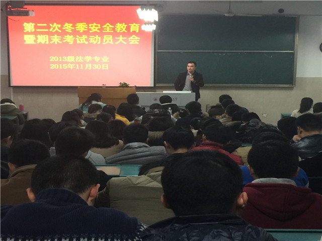 11月30日下午四点半,2013级法学专业在2020204召开第二次冬季安全教育暨期末考试动员大会。本次班会由13法学辅导员陈兴宇主持,13法学全体同学到场聆听。