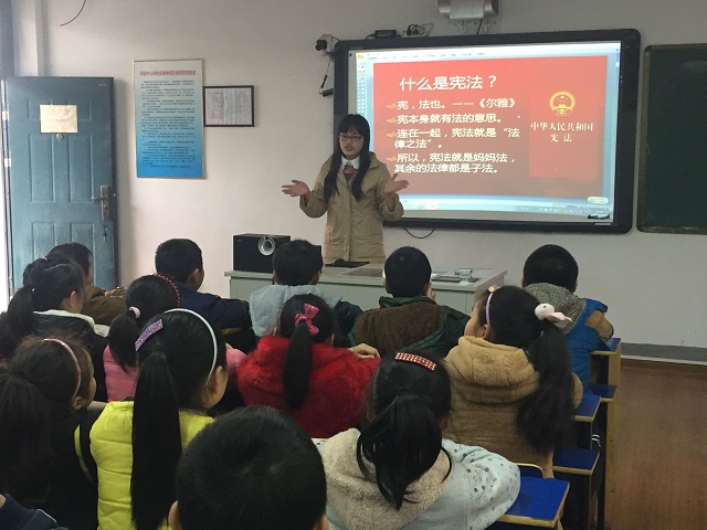 不仅仪式顺利完成,青法社普法团队的课堂活动也正常开展。中学组如期来到中学进行法制教育课。本次法制教育课以“精神冷暴力”为主题,由赵露雅、邝玉哲负责讲解。在与七年二班的员工进行简单的问候后,法制教育课变正式开讲了。首先,赵露雅用校园中常见的精神冷暴力案例引出精神冷暴力的主题。当大家发现在平常同学之间无意的话语可能会引起别人的不适时候,大家都开始认真起来,课堂气氛开始活跃起来。其次,赵露雅把精神冷暴力分为家庭冷暴力和学校冷暴力两种类型,让大家对精神冷暴力有更深层次的了解。最后,邝玉哲结合自己在生活中的经历告诉大家,冷暴力的危害性,并告诉大家不要因为自己对他人的误解等原因而对他人持有偏见,并且放映了一个简短的校园冷暴力的视频,让大家对校园冷暴力受害者有了更深的了解。最后,同学们一致表示,以后会注意自己的言行,拒绝精神冷暴力。小学方面,应街道司法所要求,小学准备了一期特别普法活动,与即将到来的国家宪法日呼应,普法主题定位宪法。芜湖电视台记者在课上课后做了采访与取材。小学组主讲人陈玉杰首先向四年级3班的同学们介绍了国家宪法日的具体日期,并以此为引从宪法的地位和作用两方面作了深入浅出的阐释。宋琴通过一个短视频向同学们具体展示了宪法所赋予受教育权的重要性,帮助大家理解宪法对于自身的作用。最后两人通过一系列漫画与同学们热情互动,将大家的思维引入故事、情节中去,通过形象手段将抽象而枯燥的法律知识生动讲述。普法课堂结束后,芜湖电视台采访了团队成员和小学员工。