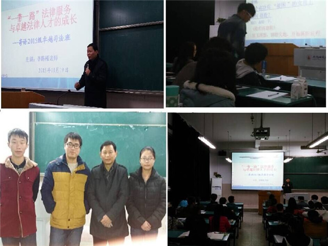 11月19日晚在2010104教室,青年法学社指导老师李路根老师应邀为15级卓越司法班主讲题为《“一带一路”法律服务与卓越法律人才的成长》的法学讲座。讲座由15卓司班团支部书记徐晨焜主持。