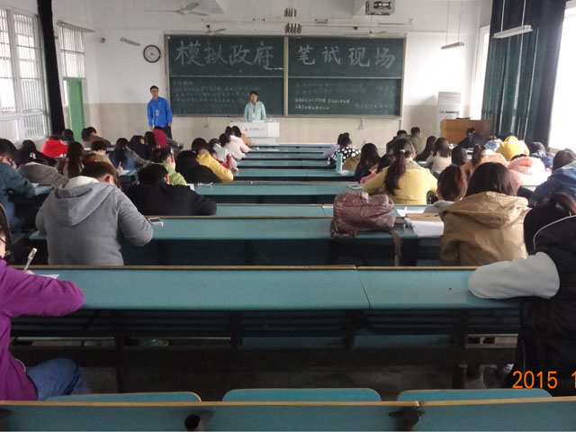 模拟政府初赛笔试于11月15日下午在行知楼举行。笔试开始开始之前,全体工作人员在2010306教室集合,进行笔试工作相关培训。本次笔试分为两场,每场笔试工作人员都分为监考组、巡考组、阅卷组三组。在简短的会议后,各监考小组分别到达2010301教室、2010302教室、2010303教室、2010304教室、2010305教室等待考生到场参加笔试。下午2点,笔试正式开始。开始考试后,考生严于律己,认真作答;监考、巡考人员也做好了检查监督的工作,保证了本次笔试的有序进行。3点第一场笔试结束,阅卷组于2010306教室开始了第一轮阅卷。20分钟后第二场笔试开始。4点20笔试结束,阅卷组开始第二轮阅卷。