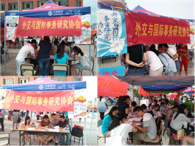 9月19日和20日,新成立的外交与国际事务研究协会的全体工作人员来到学校一食堂的南广场开展2015年社团招新工作。活动前期,社团工作人员做好宣传横幅、海报、社团宣传单、场地布置等相关准备工作。19日上午8点,工作人员已经在小广场设置好咨询台,通过现场发放社团宣传单、张贴新颖的海报和现场宣讲等形式向同学们宣传外交协会的宗旨、部门设置以及协会的主要活动,并对他们的疑惑进行耐心解答,尤其是为懵懂的大一新生答疑解惑。在整个宣传过程中,学姐学长耐心解释,学弟学妹认真倾听,成为招新现场最为和谐的一幕。经过2天的辛苦工作,社团共招收正式会员210人,圆满完成了预期的会员人数招标。