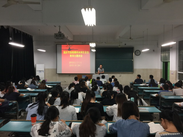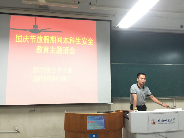 秋高气爽,金桂飘香。为做好国庆长假期间本科生的安全工作,保障员工的人身安全与财物安全,9月24日晚7点半,在辅导员陈兴宇老师的主持下,13法学2班全体同学于行知楼2010306教室内召开安全教育主题班会。