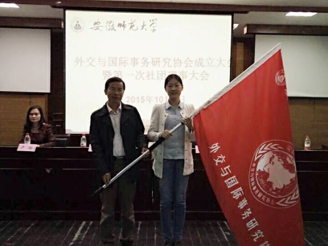 大会开始第一项,全体与会人员高唱国歌;接下来是周小凡会长代表社团致欢迎词,刘园园同学代表校社联发表讲话、王玉峰同学作为兄弟社团代表也上台发言;之后,陈兴宇老师宣读外交协会首届社团员工干部名单;紧接着由社团指导老师卢路老师为社团部门负责人和理事代表颁发工作证。在热烈的掌声中,屈书记为社团授旗,周小凡会长上台领旗。在理事代表王诗雨同学的发言之后,由社团指导老师李路根老师发表讲话,李老师谈起了外协成立的背景渊源,并为大家介绍了几位著名的外交人员,同时也强调了社团的目的以及介绍了未来将要举行的活动。大会最后由屈光峰副书记做总结讲话,他在对社团的成立表示祝贺的同时,也提出了学院对社团的三点要求:规范发展,即完善社团宗旨、章程、内容和各部分的分工;特色发展,即社团活动要与工作计划和主旨协调一致;开放发展,即要用开放的眼光望眼世界,紧扣外交国际主题,开放思路,开放心胸。