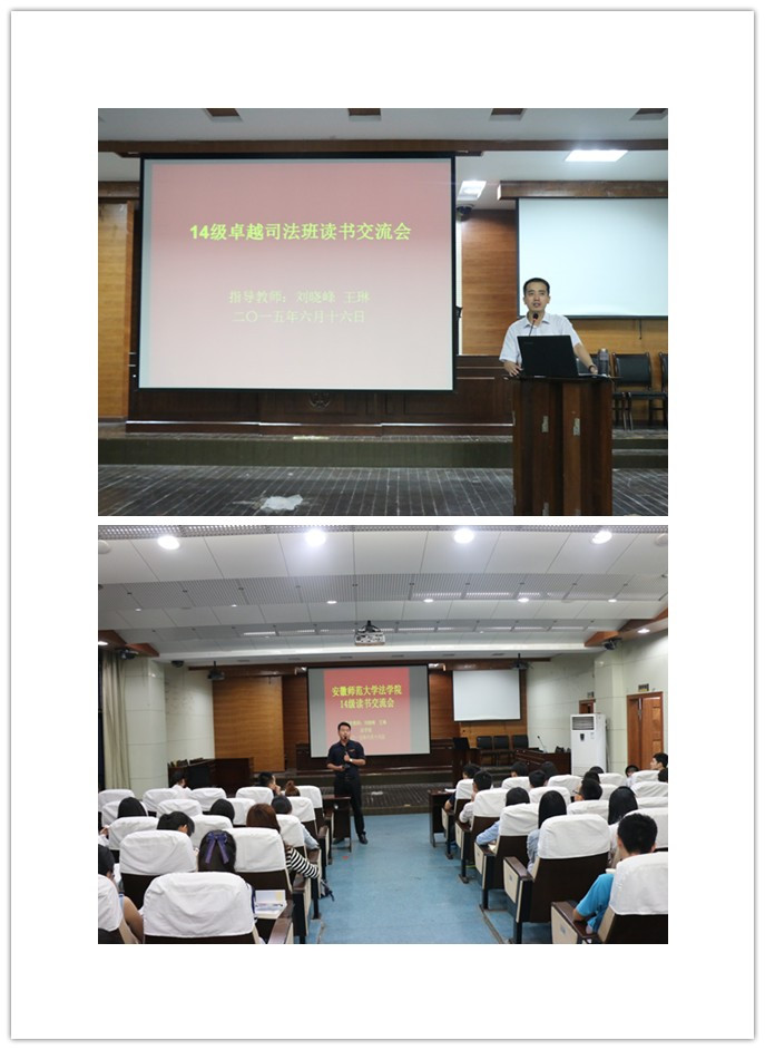 2015年6月16日晚,2014级卓越司法班在模拟法庭举办了本学期最后一次读书交流讨论会,到会指导老师有必一·运动(B-sports)官方网站硕士生导师、副教授刘晓峰,14级法学专业辅导员王琳,其他班级的部分同学也作为观众观摩了此次交流会。