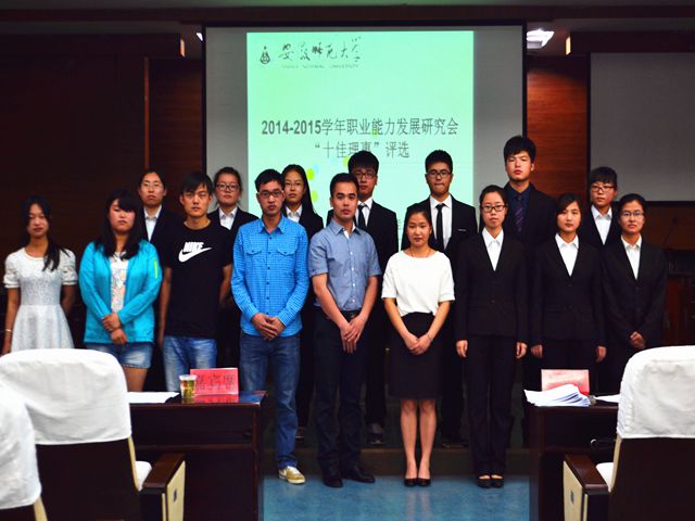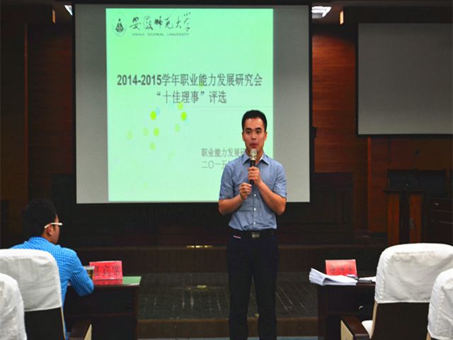 汇报评比之前,主持人首先介绍了2014-2015学年职研会的“优秀会员”,并邀请了本次活动嘉宾对“优秀会员”进行颁奖,随后合影留念。接着,主持人宣布“十佳理事”评比活动开始。12名参赛选手通过PPT的形式将理事工作的日常表现和体会感悟进行了精彩的汇报,台下掌声不断。汇报结束以后,陈兴宇老师发表了有关“祝贺”“感谢”“希望”“提醒”四个方面的讲话,希望员工干部在今后的工作中要有责任意识和奉献精神、在今后的社团活动中还要注重团队合作。最后,评委以及在场观众对选手们的汇报表现进行了投票。