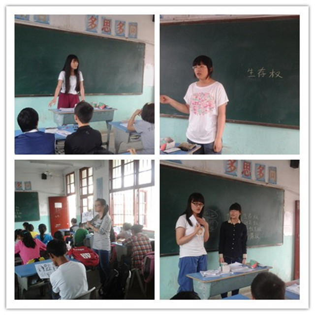 中学方面,本次普法对象是七年级二班员工。活动分成“课程导入、案例宣讲、漫画讲解、游戏互动、总结”五环节。主讲人邝玉哲以北京幼儿园员工被针扎事件入手,引入本次普法主题,课堂气氛被调动起来。随后王园园用近期的一则案例为同学们讲解未成年人所享有的权利,穿插一些生动的法律问题,员工们踊跃回答。之后便是王璐璐的漫画宣讲环节,她生动、形象的讲解,使现场员工也不甘落后,自己给漫画进行配音,引来阵阵笑声。史嘉瑞与陈玉杰则用“心有灵犀一点通”法律知识小游戏,让同学们亲身参与到“案例的模拟与法律知识的抢答”中去,整个普法活动达到高潮。最后,邝玉哲作了这次普法的总结。本次普法在吸取和借鉴上次普法经验的基础上,对原有进行了内容的改进和形式的创新,达到比较普法、阶梯上升的效果。