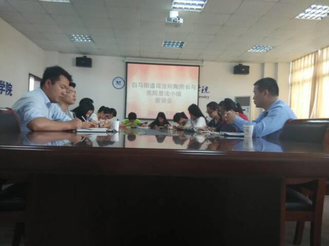5月22日下午1点半,白马街道司法所陶所长与公司普法小组座谈会在院行政楼四楼会议室召开。14级法学辅导员兼普法小组指导教师王琳老师以及普法小组核心成员参加座谈会。