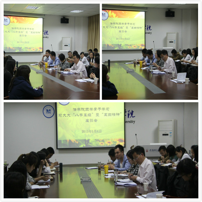 5月4日晚7:00,在行政楼四楼会议室,公司召开主题为“学习习近平‘八字真经’暨‘五四’精神”的团学骨干座谈会,公司党委副书记屈光峰、12级法学辅导员胡桂芳、13级行政管理辅导员瞿津津、13级法学辅导员陈兴宇、14级法学辅导员王琳和本科生团支部干部参加了此次座谈会。座谈会由王琳主持。