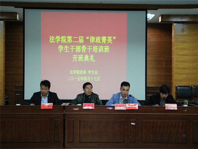 活动伊始,全体起立,奏国歌,培训班开班典礼在庄严的国歌声中拉开了帷幕。接着,14级行政管理专业马丹宁宣读了本期参加培训班的学员名单。14级法学专业胡红婷同学代表全体学员发言,表达了对学院领导的感谢,并承诺严格遵守培训制度、努力锻炼和提升自我成为真正的法苑先锋。屈光峰从员工学习和干部素质提升两个方面进行阐述,号召与会员工干部树立服务意识、发觉意识、问题意识、表率意识等,正确认识员工组织,准确定位员工干部,真正做到学有所需,学有所获,学有所长。开班仪式结束后,院领导老师与第二期“律政精英”培训班全体成员合影留念。