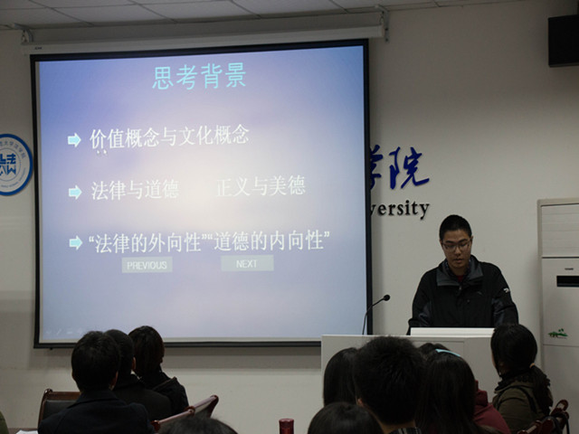为凸显公司司法实验班的人才培养特色,读书交流会的核心思想是学会读书、学会表达、学会倾听、学会提问。首先上场的国富论小组谈起了货币和商品的关系,发言人朱庆阳提出:原始社会中不存在货币只存在物物交换,那时大家熟悉的一般等价物行使了货币的职能,充当平常商品交换的媒介。之后上场的法哲学小组则从价值和文化概念谈起了道德和法律的关系并就二者发生冲突时如何解决与同学们展开讨论。冯弋珩认为法律是维护统治阶级利益的工具,道德是维护统治阶级地位的工具。二者同属于上层建筑,分属制度文明建设和精神文明建设的范畴。法律的实施需要道德的奠基和支持,道德的实施需要法律的强制保障。余老师分别就每个小组的课件展示发表了自己的意见和建议,得到了同学们的一致认可和好评。