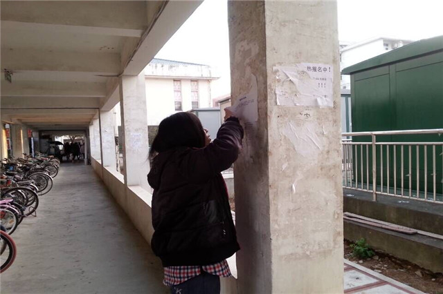 近日,13行管班级同学以团小组为单位,开展“我为环保做点事”义务劳动。班级同学拿起工具主动清理起寝室楼道、户外墙壁、电线杆上的小广告。看到墙壁、门窗恢复本色,同学们露出满意的笑容。
