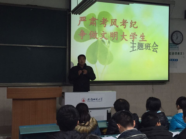 随着期末考试的日益临近,为了让同学们以正确的心态面对期末考试,杜绝考试作弊事件的发生。2014年12月23日晚7点在2050201教室举行了考风考纪主题班会,由14级法学辅导员王琳老师主持此次主题班会,2014级法学一班和卓越司法班全体同学出席。