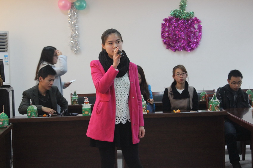 之后,鲍亮同学献唱一首《天上人间》,并进行了四组“夹气球比赛”游戏,充分体现了同学们之间的团结协作能力。姚远及潘雪松等同学用家乡话朗诵了海子的诗歌《面朝大海春暖花开》,让同学们感受到不同地区方言的魅力,笑声、掌声和欢呼声持续不断。 随后的抽奖活动和游戏“害你在心口难开”更是将茶话会的气氛推向高潮。最后主持人给大家播放了本届研究生从入学到现在所参与的活动以及生活中的照片,大家回味无穷。