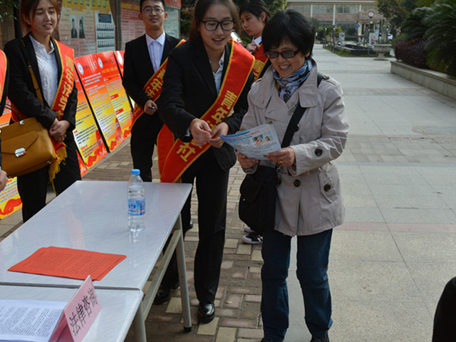 下午一点四十开始,各成员在学校西门集合,做好出发准备。两点十分,大家到达社区与小区工作人员会面,社区工作人员表示热烈欢迎并全力支持配合。在他们的配合之下宣讲成员迅速布置好场地。随后,大家明确分工任务,开始了普法活动。首先,部分宣讲员邀请来往居民观看展板,其他宣讲员为观看的居民细细解释展板内容。随后,宣讲员通过派发印有关法律常识的传单给过往居民,并且邀请他们在横幅上签字。不时有来往的居民上前观看签字。最后,活动成员在横幅上签字,并且拍照留念。