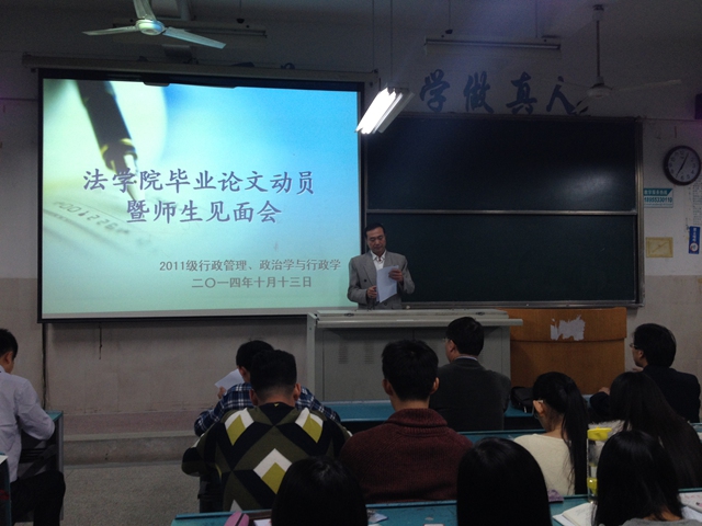 10月13日晚7时,11级政治学与行政学、行政管理专业召开毕业论文动员暨师生见面会,公司党委组织委员何源章以及公共管理系诸位教师参加了此次会议。