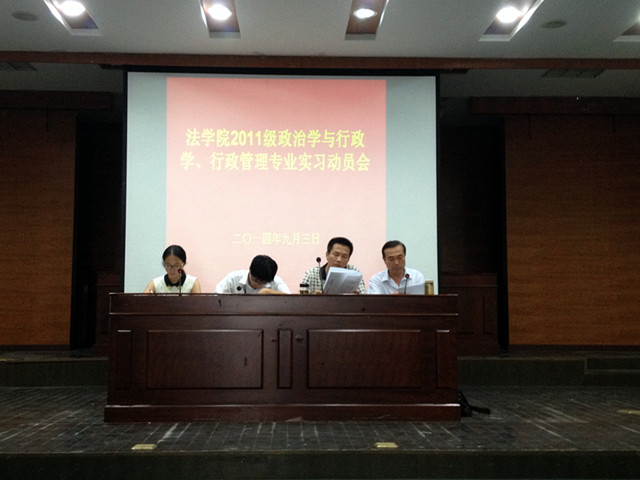 9月3日下午,2011级政治学与行政学、行政管理专业召开实习动员大会。教学副经理严宏、科研副经理周俊强、公共管理系主任周仁标老师、辅导员瞿津津以及全体实习指导教师出席此次动员大会。