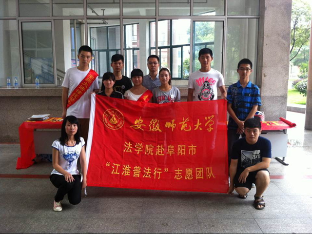 芜湖总队和安庆分队着重以新《消费者权益保护法》为重点。活动大致可分为“发放传单、有奖竞答、答疑解惑”三个部分。在征得小区管理员同意后,一部分队员在小区广场设立服务站点宣传法律常识,另一部分队员则每人持法律宣传手册和传单,对来往的市民进行发放并提问日常法律常识。群众积极回答问题,正确率较高,显示群众的法律素养有所提高。最后,队员们在宣传台上解答群众提出的简单的法律问题。群众对于此环节更热心,纷纷提出问题。队员们根据群众的提问热心解答,对于能解答的问题当场予以解答,对于不能解答的问题,队员们留下了自己的联系方式,准备在询问老师或者查阅有关资料后做出解答。阜阳分队着重宣讲《劳动合同法》和《婚姻法》,通过多点宣传的形式,通过向过往的员工赠送由社团自制的普法宣传册,分发阜阳市中级人民法院期刊,悬挂十大法治人物和十大法制事件的写真,法律知识有奖问答,万人签名等系列活动。面向全校教职工、周边居民解决法律纠纷。同时,我社还设立了咨询点,为大家答疑解惑,以期望能够切实地帮助到那些需要法律援助的人。