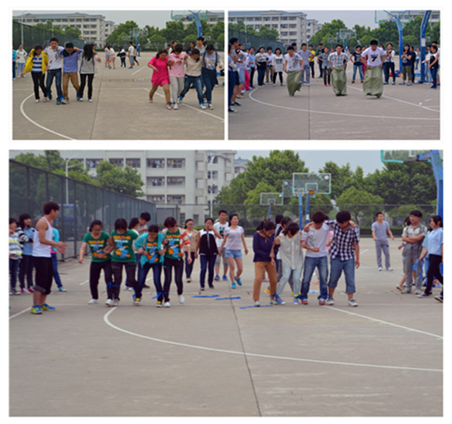 活动开始前,工作人员有序的组织选手,宣布比赛规则。本次比赛采取积分制,每个小项目第一名5分,第二名3分,第三名2分,其余组1分,最后累计,分数最高的前三名为优胜者。首先,进行的比赛项目是“四人五足”,旨在培养同学们的团队协作意识。“企鹅漫步”项目中,参赛者需两腿、两手臂夹3本书,成企鹅状行走。在“袋鼠跳”的项目中,同学们站在麻袋中跳向终点,你追我赶,场面异常火爆。接着,在随后的“跳长绳”和“趣味篮球”中,大家相互配合、愈战愈勇,努力赛出自己最好的水平。最后,经过激烈的角逐,此次比赛评选出了一、二、三等奖。