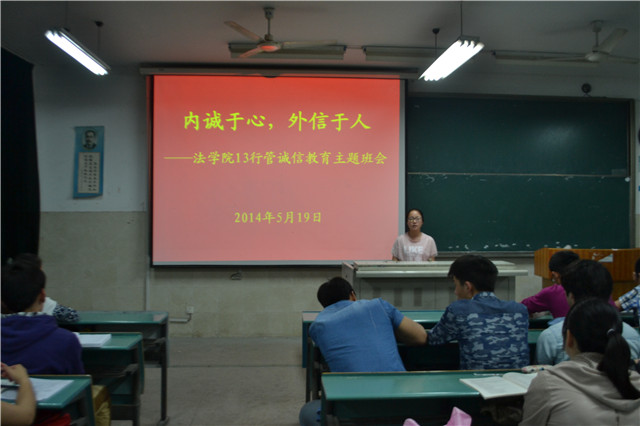 5月19日晚,13级行政管理班级同学在2010604教室召开诚信教育主题班会,班会由本专业辅导员瞿津津主持。