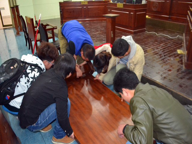 整个志愿服务活动分为两部分,在彭老师向同学们介绍了主要工作后同学们便认真开展起来。首先,同学们将教学法庭的桌椅、墙壁等卫生死角进行了彻底的清理打扫;其次,同学们按照彭老师的要求按照庭审的标准将教学法庭摆放整齐。