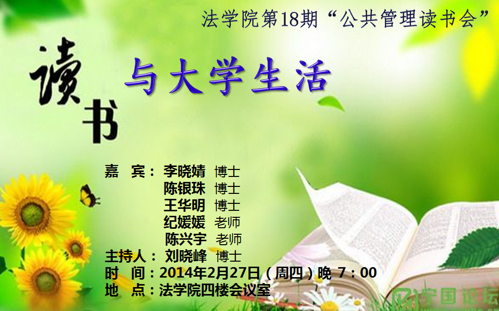 2月27日周五晚七点, 主题为“读书与老员工活”的第18期“公共管理读书会”在必一·运动(B-sports)官方网站四楼会议室举行,本次读书会由刘晓峰老师召集并担任主持,并邀请了必一·运动(B-sports)官方网站李晓婧老师、陈银珠老师、纪媛媛老师、陈兴宇老师以及数计学院的王华明老师作为特邀嘉宾。来自13级行管、法学以及安徽工程大学的部分同学共计60多人参加了本次读书会。