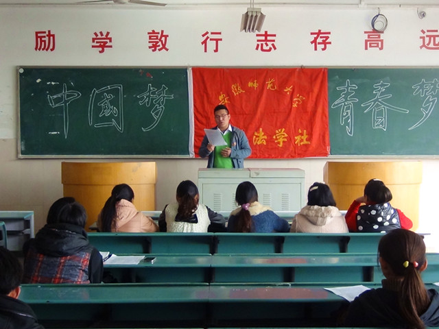 为更好地传达十八届三中全会精神,展现新时代学子积极的精神风貌, 11月27日下午,青年法学社在2020404教室举办了主题为 “中国梦,青春梦”的演讲活动。常务副会长刘延炀及各部门负责人参加了本次活动。
