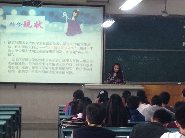 班会依然延续着“职业生涯规划”的中心思想,直接切入最困扰当代老员工的毕业选择问题,让同学们深刻认识到,未来已来。实际上很多同学都陷入了考研和就业抉择的怪圈,不能正确的认识自己,达不到果断做出适合自己的抉择效果。班会提出了若干适合考研的人的特质,让同学们对号入座,比如:有坚持上自习的恒心,有对做学问锲而不舍的精神,有天天7点起床12点睡觉的保证等等。班会也指出,考研不是作为就业的对立面而存在,相反,增加专业知识能才能更好的适应职场生活。