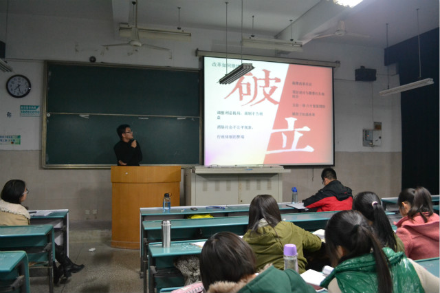 樊浩同学先总体概括了公报中改革的重点和措施,接着他从经济、政治、文化和生态方面对会议公报做了具体的阐述。在谈及经济改革时,樊浩介绍到经济改革是全面深化改革的重点,其核心问题是处理好政府和市场的关系。而政治改革同样重要,它将为经济改革铺设道路。文化反作用与政治经济,必须要全面深化文化改革。生态文明建设在现在社会越来越重要,公报指出必须建立完整的生态文明制度体制,用制度保护生态环境。随后,他以芜湖市著名企业“傻子瓜子”为例,一小见大,折射出中国改革开放三十五年来的得与失。最后,樊浩同学讲到了人民对改革的期待,公报的发布只是改革的又一新起点,中国的改革之路虽然道路曲折,但是前途光明。