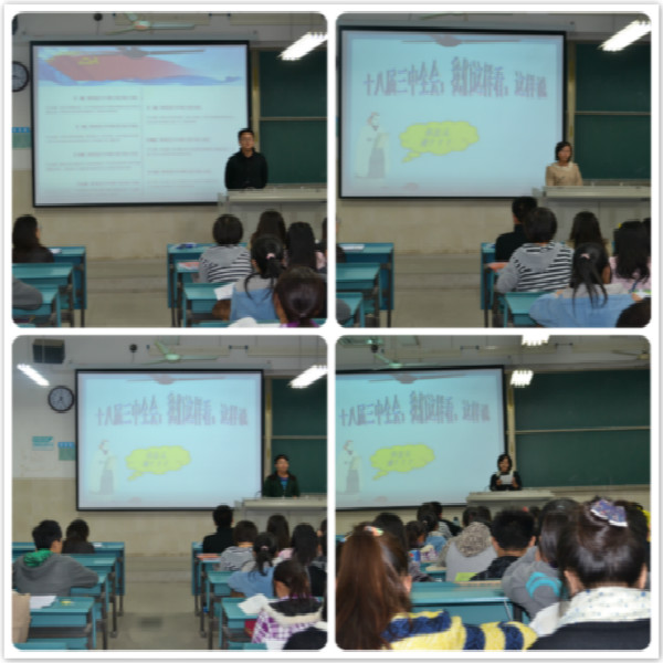 活动伊始,李锦霞以PPT的形式向同学们介绍了十八届三中全会的有关内容,两段形象直观的视频一下使同学们对十八届三中全会有了更深入的了解。接下来,四位同学代表进行“我看十八届三中全会”的演讲。樊浩同学围绕改革开放这一主题,以家乡铜陵的户籍制度改革为例畅谈了自己对改革开放的认识。沈修武和徐慧则以历届三中全会为线索,从改革开放前夕的十一届三中全会到本届三中全会,期间谈及对教育、反腐、公平等热点问题的个人观点。余平平同学梳理了改革开放以来中国的发展历程,阐述了作为一名大一新生对十八届三中全会的认识。