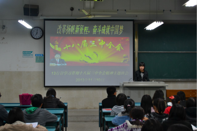 11月10日晚,13级行管全体同学在2010201教室举行了以“改革扬帆新征程,奋力成就中国梦”为主题的贯彻落实十八届三中全会精神的班会。班会由团支部书记李锦霞主持,13行管辅导员瞿津津参加。