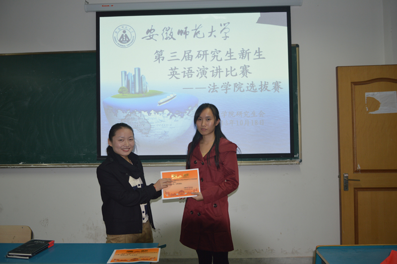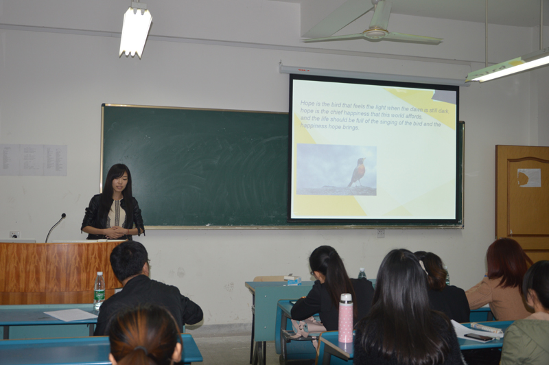 为提高公司研究生对学习英语口语的兴趣,10月18日晚6:30,必一·运动(B-sports)官方网站研究生英语演讲比赛在研究生A9教室举行。应邀担任本次比赛的评委有:校研会常务副主席段欣、必一·运动(B-sports)官方网站常务副主席熊飞、必一·运动(B-sports)官方网站研会宣传部长陶莎以及11级宪政专业的陈萍同学。公司程晶、洪云、葛正英、田青4名同学参与了此次竞赛。
