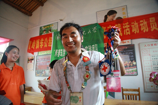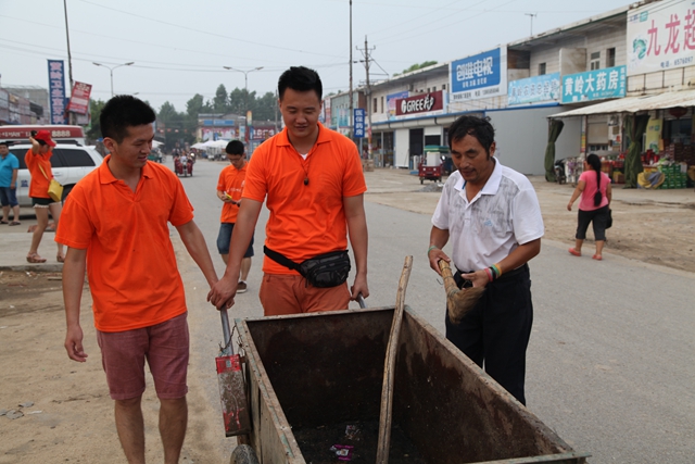 当实践团队的队员们进入到不大的诊所时,映入眼帘的是他黑黑的皮肤,憨厚的笑容,身后满墙照片和锦旗记录着这位环保达人的环保历程和所获殊荣。他一直专注于手中的工作,当被问到坚持环保志愿活动这样一件辛苦的事情7年是怎样的心态的时候,侯现中笑呵呵的回答说他从未感觉孤单,在他看来环保志愿的历程其实也是一种旅行,在这样一个路途中,捡垃圾也是一种快乐。队员们被这种乐观态度感染,主动要求跟随环保达人去转运街上的垃圾,36度的高温,爬满苍蝇的垃圾,恶臭的气味,青年志愿者们在侯现中的带领下不怕脏,不怕累运了整条街满满3车垃圾,一位志愿者感慨的说道:“做一次好事容易,但是能向侯现中一样常年坚持做好事是一件极其不容易的事”。看到侯现中身上被刮破的衣服和因救火而烧破的裤脚,队员们禁不住眼眶湿润。