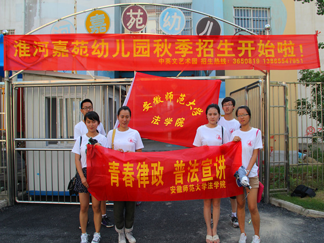 7月8日、9日两日,12法学普法实践团队赴淮南市,以“青春律政 普法宣讲”为主题,围绕着“婚姻家庭法”开展2013年暑期社会实践活动。此次活动主要分为两个部分“走进嘉苑幼儿园关爱儿童成长”、“走进龙湖公园 宣讲婚姻观念”。