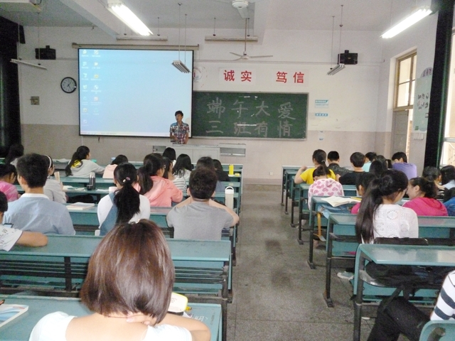 班会伊始,班委成员有序向大家分发了提前准备好的粽子。接下来,班长于志立对这一学期班级主要活动进行了简要回顾,并通过多媒体方式向大家展示了近半年来同学们参加各项活动的图片。随着一张张图片的播放,一次次活动涌现在同学们的面前,同学们一边吃着粽子,一边回忆过去,祈盼未来。班会最后,于志立在预祝同学们端午节快乐的同时提醒同学们,要认真复习积极应对即将来临的期末考试。