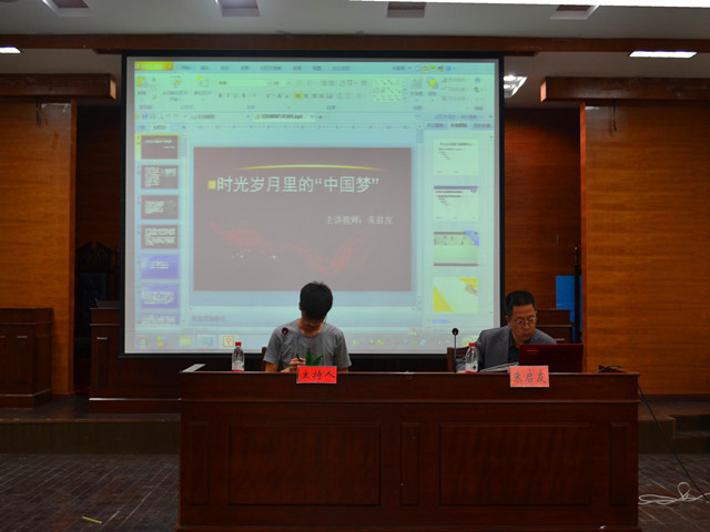 讲座开篇以“世界上真有中国梦吗,从什么时候开始的?”等问题来引起同学们的思考。接着朱启友分时期的从“天下梦”、“独立梦”、“强国梦”三个阶段详细地向同学们阐述了真正中国梦的涵义,提出了自己对“如何实现人民幸福”的看法。他还鼓励现在的青年人秉承五四精神,勇担历史的重任,坚脚踏实地,怀揣着新一代的中国梦,用“青春梦”谱写“中国梦”的精彩篇章。朱启友以其幽默诙谐的语言、轻松的讲解方式让同学们在愉快的氛围中领悟了报告会的主题。最后,报告会在一曲《中国梦》中结束。