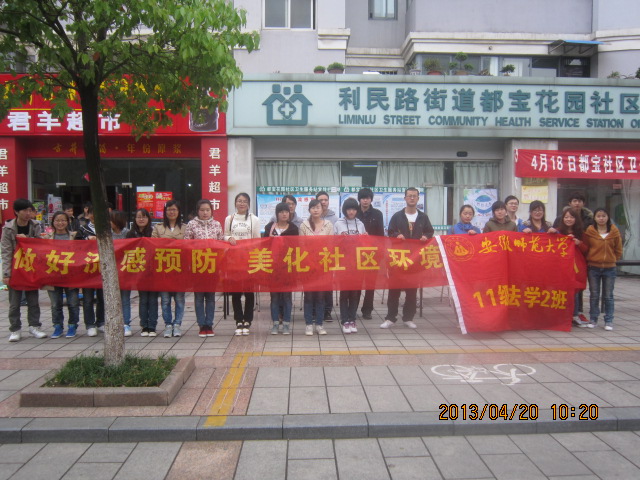 在进行了初期准备工作之后,同学们分为若干宣传小组,走进社区各处,向社区居民发放宣传材料并就如何防治H7N9禽流感向大家做出讲解。在社区卫生服务站前设置的宣讲点,同学们与卫生服务站的医务工作者一起为居民们做义务服务工作,回答大家关于H7N9的疑问以及为社区居民免费测量血压。与此同时,宣讲组在卫生服务站前宣讲禽流感相关知识。在活动进行中,专门成立的志愿小组则为都宝花园社区免费打扫卫生、擦拭宣传栏等,得到了社区居民的一致好评。